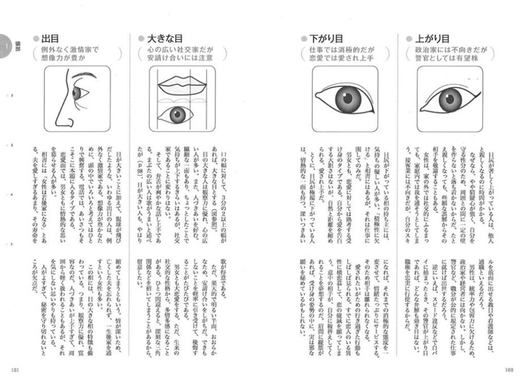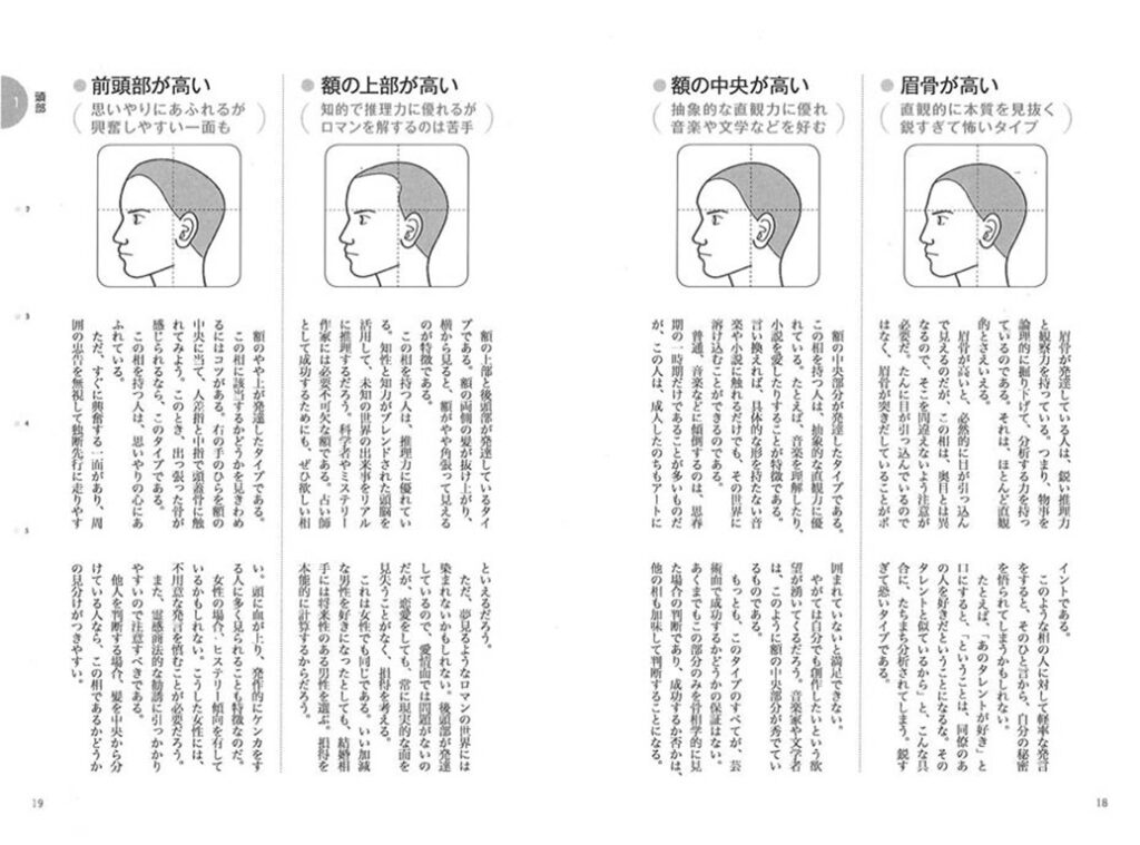 第1章「頭部」では、頭や顔の形から、目、耳、鼻、口など顔の各パーツはもちろん、眉や歯、ホクロの位置や形などを解説しています。