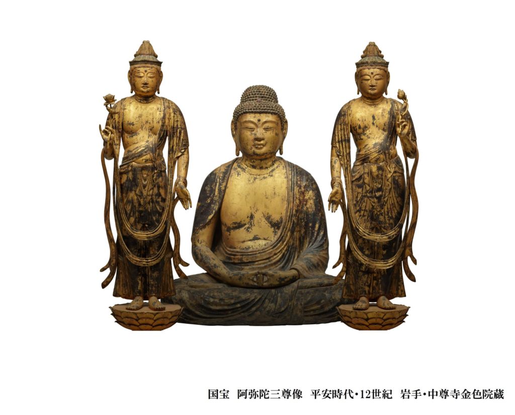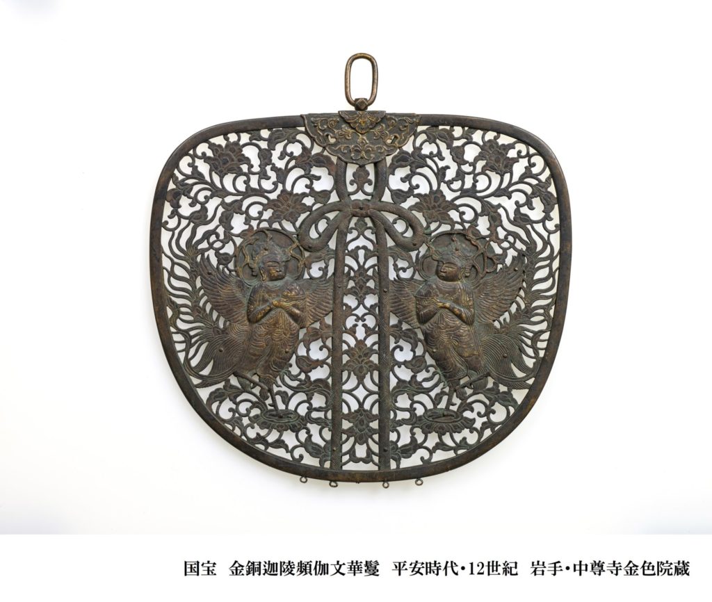 本展では、普段は金色堂の中央にある須弥壇(しゃみだん)に安置されている国宝の仏像11体が、一堂に展示される。須弥壇の中でも最も重要という、中央壇にある仏像が揃って寺外で公開されるのは初めてのことだ。さらに、かつて金色堂を荘厳していた国宝・金銅迦陵頻伽文華鬘(こんどうかりょうびんがもんけまん)をはじめとする工芸品の数々も紹介される。