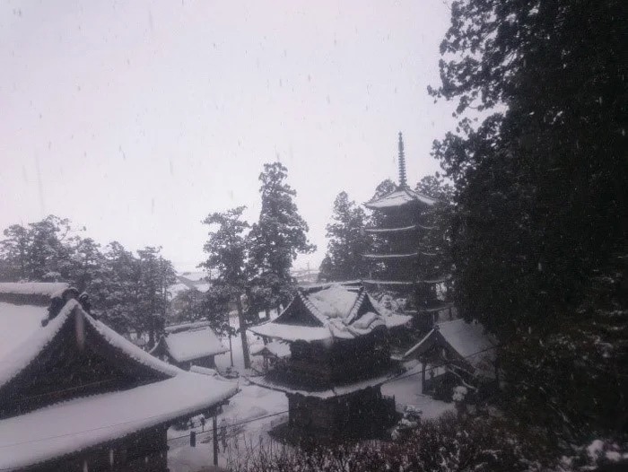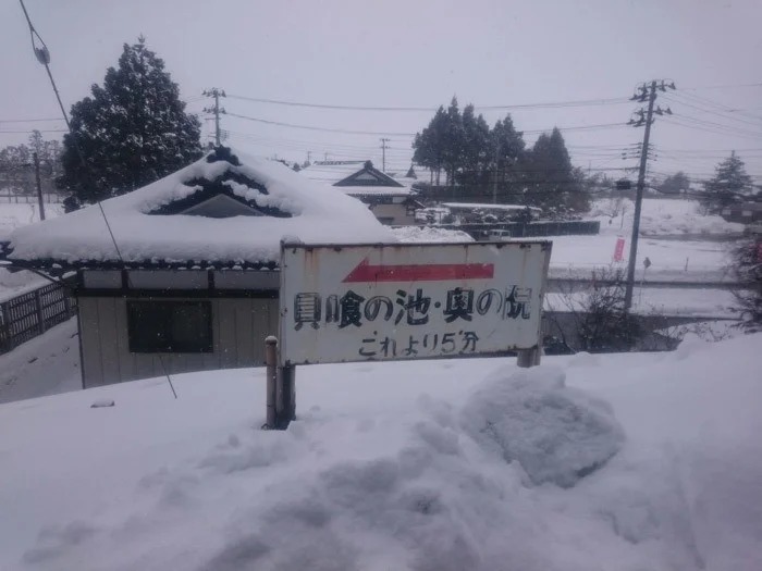 雪深い善宝寺。貝喰の池は少し奥のほうにあり、アップダウンのある道を徒歩10分ほどはかかります。降雪のため大変な状況でしたが、行くしかありません。そして貝喰の池に到着しました。