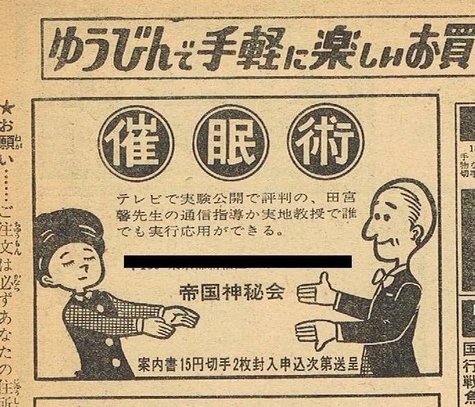 「帝国神秘会」とは、大正時代に発足した日本の「霊術団体」の草分け的組織。戦前に大ブレイクした第一次催眠術ブームにおける中心的存在。当時から一般向けの「催眠術入門書」を多数刊行し、戦後もテレビの催眠術特番などに登場。70年代は主に週刊マンガ誌に「催眠術通信教育」の広告を大量に出稿し、子どもたちにもおなじみになっていた。当時の僕はもちろん催眠術師にも憧れたが、この「帝国神秘会」という組織の名称にも多大な憧れを抱いた。結社の名前として、これほどカッコいいものがほかにあるだろうか?