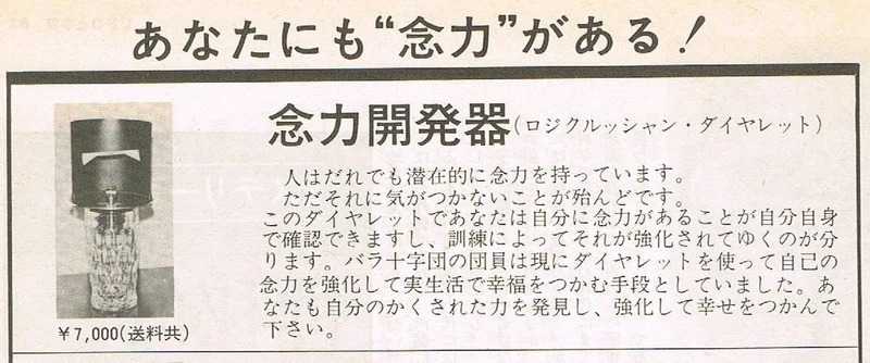 ●「念力開発器」(1977年のUFO専門誌より)。当時あちこちの雑誌に掲載されていたが、どういう商品なのかまったくわからなかったのがコレ。要するにローターをテレキシネスで回すための訓練マシンだったらしい。どう見てもただの風車のようなシンプルな構造だが、これで当時価格7000円というのはどうなのか?