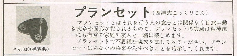 そうした数少ないグッズのなかでも幼い僕のオカルト心を強烈に刺激したのが、70年代の広告によく登場していた「プランセット」だ。「プランセット」とは、欧米風「こっくりさん」を行うためのツール。当初は何に使うものなのかよくわからなかったが、テレビで見た映画『エクソシスト』でリンダ・ブレアが「ウィジャボード」で遊んでいるのを目にし、「コレがアレだったのか!」と納得した。