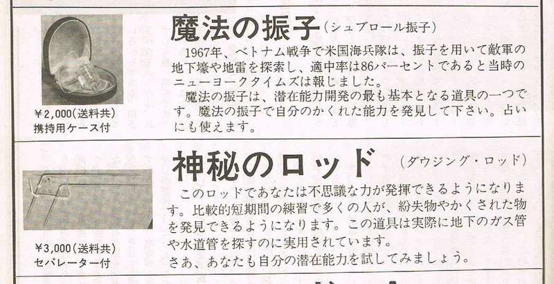 ●「魔法の振り子」「神秘のロッド」(1977年のUFO専門誌より)。「魔法の振り子」は「ダウジング」用のペンデュラム、「神秘のロッド」は古典的なダウジングロッド。