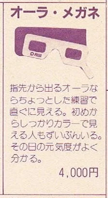 ●「オーラメガネ」(1987年のオカルト誌より)。この商品は通販広告よりも、70年代に都内各地にあったアイデア雑貨ショップ「王様のアイディア」で売られていた印象が強い。これを装着して訓練すると、霊的オーラを目視することができるようになるらしい。