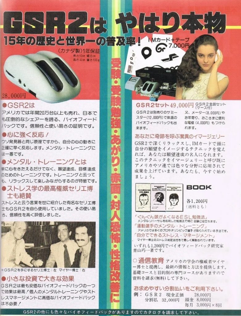 ●「GSR2」(1987年のオカルト誌より)。70年代から80年代にかけて、やたらとさまざまなメディアに掲載されていた「GSR」シリーズ。これまた「王様のアイディア」でも定番商品になっていた。パソコンのマウスのような形の機器に手で触れているだけで、心も頭脳も鍛えられるメンタルトレーニングマシンだったらしい。「セリエ博士(ストレス学の権威、ハンス・セリエ)も絶賛!」とか「アメリカやソ連ではいろいろな分野に応用されています」とか、非常に説得力の高い広告である。