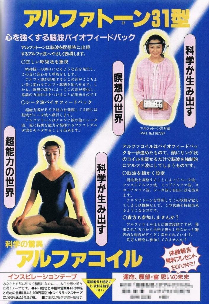 ●「アルファトーン」「アルファコイル」(1987年のオカルト誌より)。こちらは集中力アップだけでなく、ESP能力の開発までできてしまうマシン。脳波を強制的にアルファ波、シータ波などに変えてしまう冥想ツールだ。一見怪しげだが、昨今、スマホのアプリなどで一部に流行している「バイノーラルビーツ」の先駆けのようなモノだったようだ。