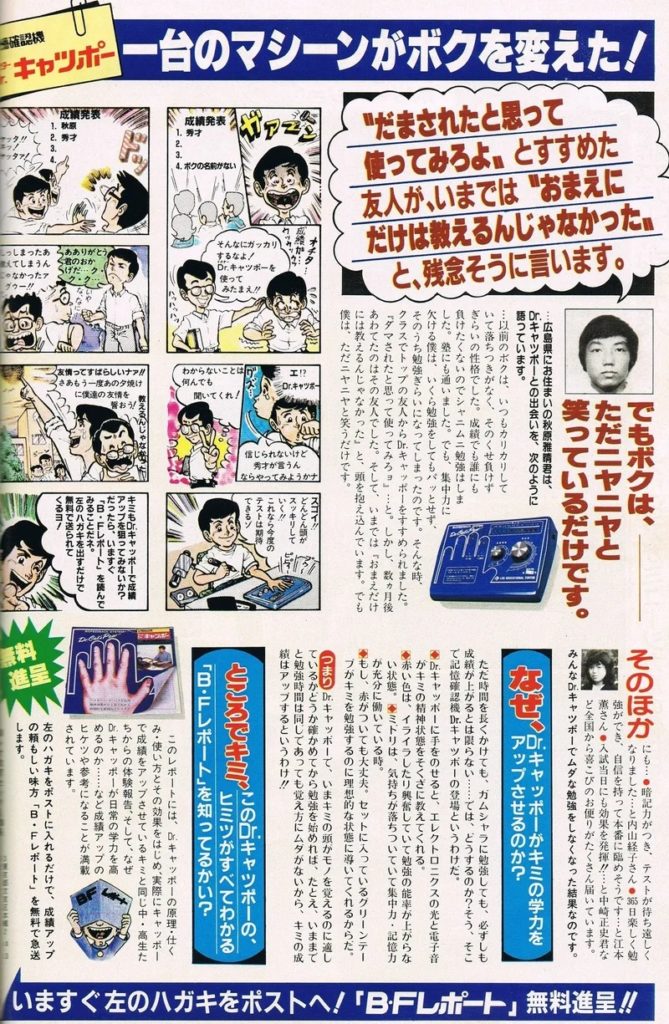 ●「Dr.キャツポー」(1983年の映画雑誌より)。70年代からマンガ誌などでもおなじみだった名物広告。機器のデザインがカッコよくて、小学校時代は心底憧れた。マシンに手のひらを置くだけで、精神を「勉強するのに理想的な状態」に導いてくれるとのこと。原理はいっさい書かれていないので不明だが、専用ハガキをポストに入れると「原理・仕組み・使い方」の詳細と、成績アップを実現した体験者レポートをまとめた冊子が送られてくるシステムだったらしい。