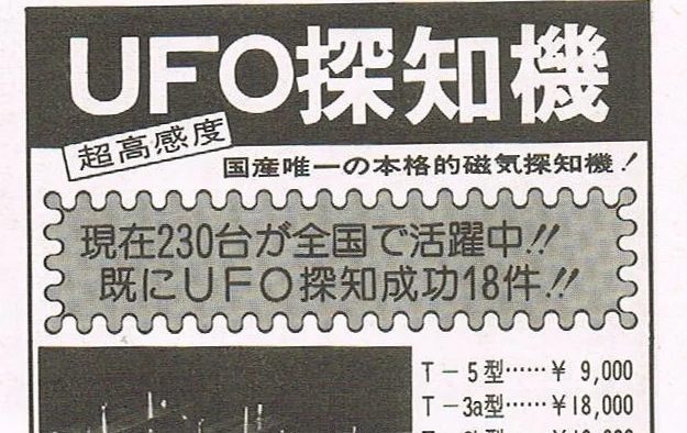 ●「UFO探知器」(1977年のUFO専門誌より)。70年代のUFO専門誌(といえば、ほぼ一誌に特定されてしまうが)によく掲載されていた商品。具体的な説明がまったくなく、どういう装置だったのかは今もって不明。「探知成功18件!!」と誇らしげに書かれているが、「18」という数字も非常に微妙である。この画像ではモザイク処理をしたが、申込先が個人宅になっているのも興味深い。