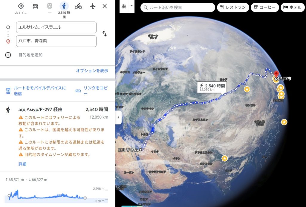 新井「地球の歩き方のスタンスとしていうと、『キリストが青森まで行けるわけないだろ』という反応もありますが、Googleマップで検索するとエルサレムから青森までの距離は12050キロ。徒歩でのルートと時間まで表示されるんだけど、それをみると2540時間とある。1日8時間歩くとすると1年かかりらない距離です。つまり『行けるわけないだろ』ということではないんだよね……と、これが地球の歩き方的にいえることですね」