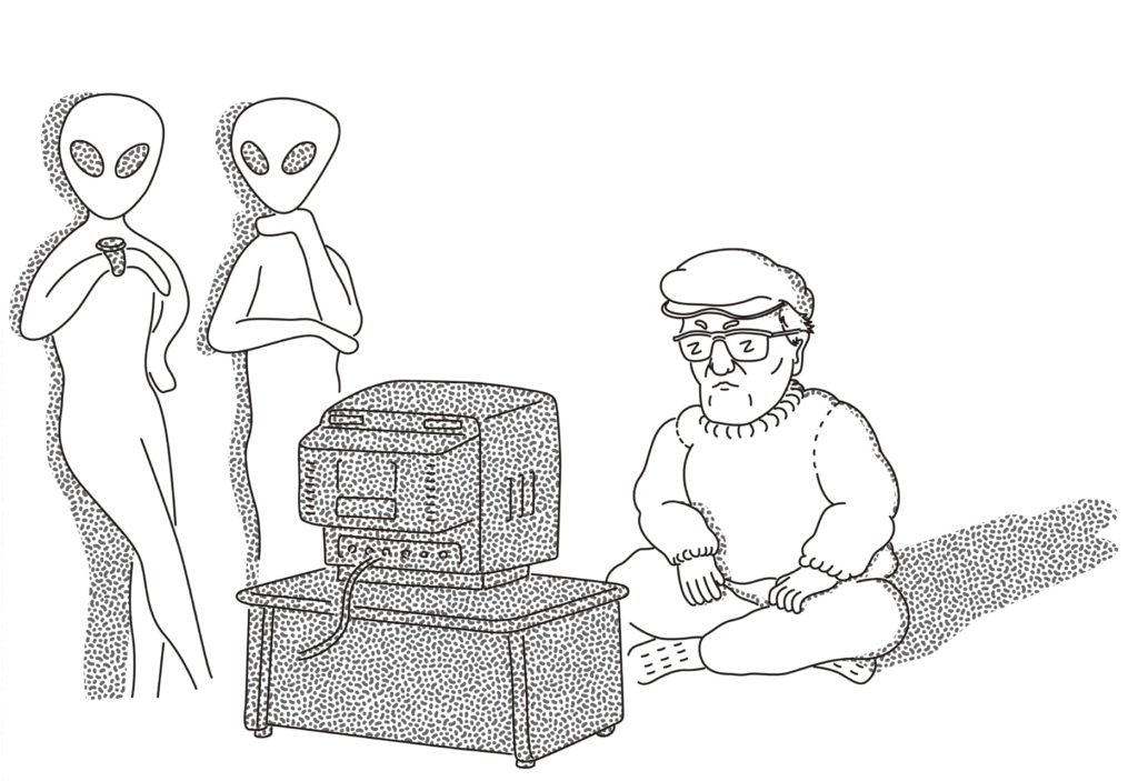 異星人から呼び出されるとき、岡さんは「だいたいボクはね、そういうときテレビを見てるの」という。テレビ? 一体何の番組を?