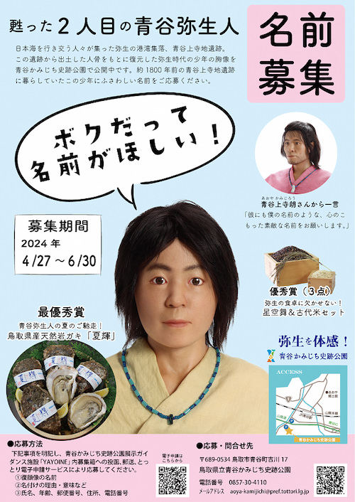 鳥取県は青谷上寺地遺跡から出土した弥生時代の頭蓋骨をもとに顔を復元した。頭蓋骨は10代前半の少年のもので、県では名前を募集している。弥生時代の頭蓋骨の復元としては2021年に青谷上寺朗と名づけられた成人男性に続き2人目で、6月30日まで受付。6月4日付『日経新聞』夕刊「僕にも名前つけて!」及び同日付『東京新聞』夕刊「僕に名前つけて」に関連記事。