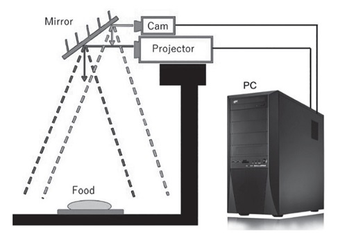 味と色のクロスモーダル効果を調べるため、横浜国立大学の岡嶋克典教授らはプロジェクターから投影する光の彩度と色相を変え、食品の味にどのような影響があるのかを調べている。(※1)