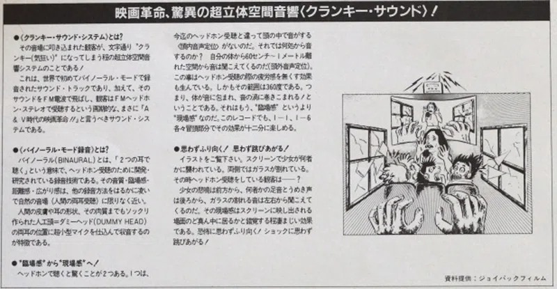 この映画が日本で公開されたときに話題になったのは、「クランキーサウンド」という画期的な新音響システム。当時売り出されていた「FMウォークマン」など、FMラジオを聞くことができるポータブルステレオプレーヤーを映画館に持ち込み、ヘッドフォンで聴くことができる特殊な上映だった。映画内で再生される音を、観客が持ち込んだ個々の機器へFM電波によって飛ばしていたわけだ。これにより「バイノーラル録音」(人間の頭部を模したダミーヘッドを用いて立体的に録音し、実際に現場に居合わせたときに聞こえる音像をリアルに再現する)された360度の超立体音響が楽しめた。