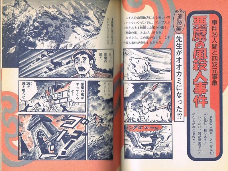 スイス山間部では、ときおり「悪魔の風」と恐れられている風が吹く。この風にさらされると、一部の人間は突如精神に異常をきたして凶暴化するというのである。本書ではいくつかのテーマが「劇画」で説明されているのだが、この現象も「悪魔の風殺人事件」というタイトルのマンガで紹介されている。