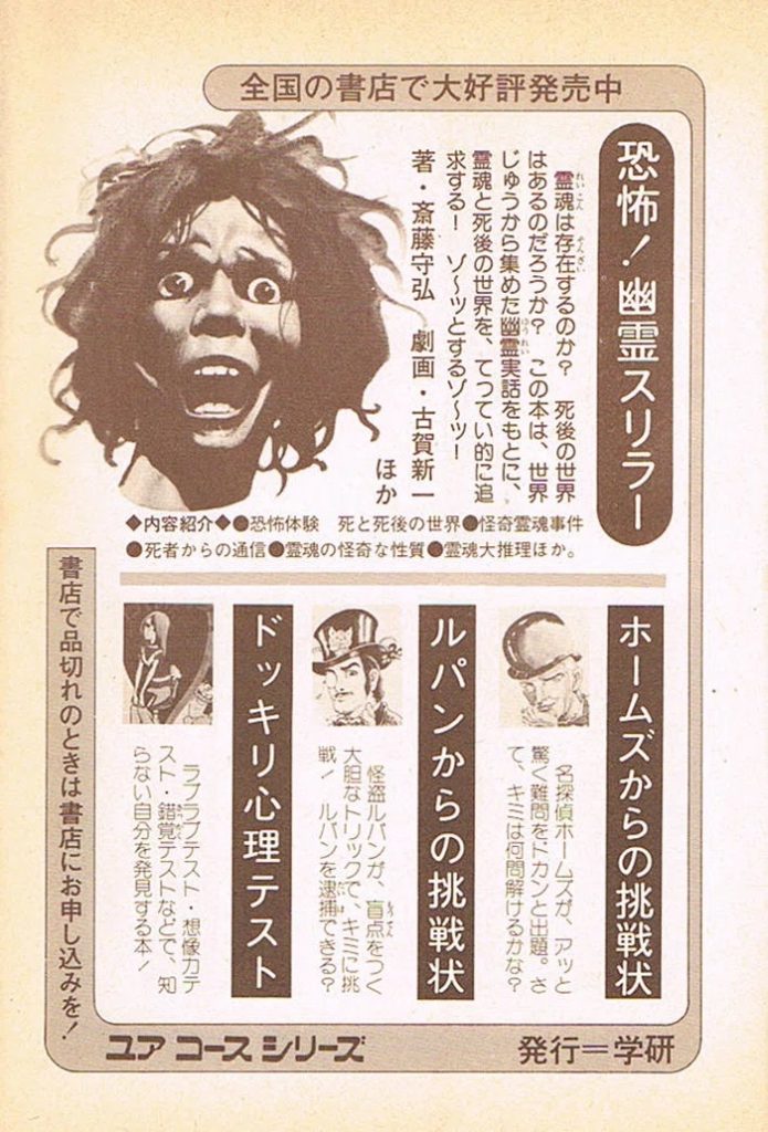 オカルト系のテイストもやはり「ジュニアチャンピオン」よりもエグく、かなり強烈な印象を残す巻が揃っていた。僕の印象に残っているものを並べてみると、『世界の恐怖怪談』、『恐怖!幽霊スリラー』、『ショック!人体の怪奇大百科』、『大異変!地球SOS』などなど……。このあたりは同世代の多くがトラウマ本として記憶していると思う。エグさの一方で、やはり学研らしく「科学入門」的な要素も加味されており、不思議現象を科学的に解明する構成のオカルト本も多かったと思う。