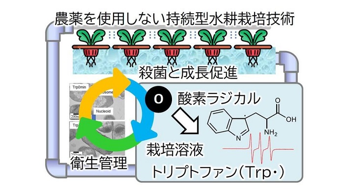トリプトファンは大腸菌(植物には有害)が好んで食べるが、活性酸素付きのトリプロファンは大腸菌にとっては猛毒だ。大腸菌は殺菌され、殺菌水として利用できるのだ。