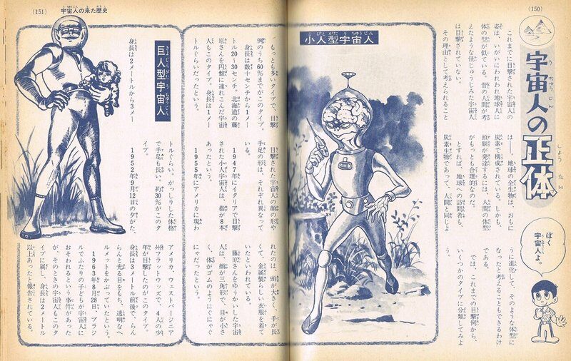 もちろん米国のSF雑誌やSF映画などでは、当初から多種多様な宇宙人が登場し、戦後は日本にもそうしたものが続々と紹介されていた。日本の子ども文化においては、主に週刊マンガ雑誌の巻頭カラー口絵などで「さまざまな宇宙人」などのタイトルの特集が組まれることが多く、たとえばアメリカでは昔からおなじみの「ベム」(多くのSF作品に登場した昆虫のような目玉を持つモンスター)なども、こうした図解記事によって日本の子どもたちに知られるようになった。とはいえ、やはり「わかりやすい宇宙人」としては、依然として「タコ型」が用いられていたのだろう。
