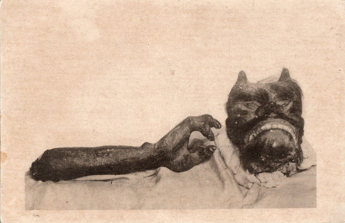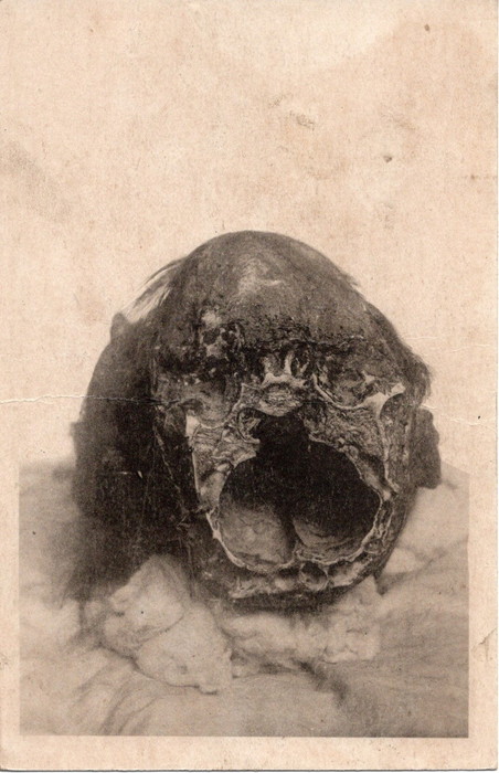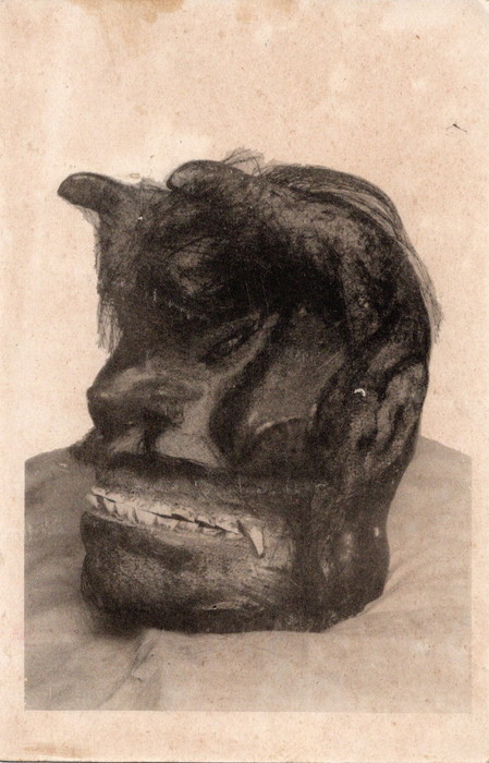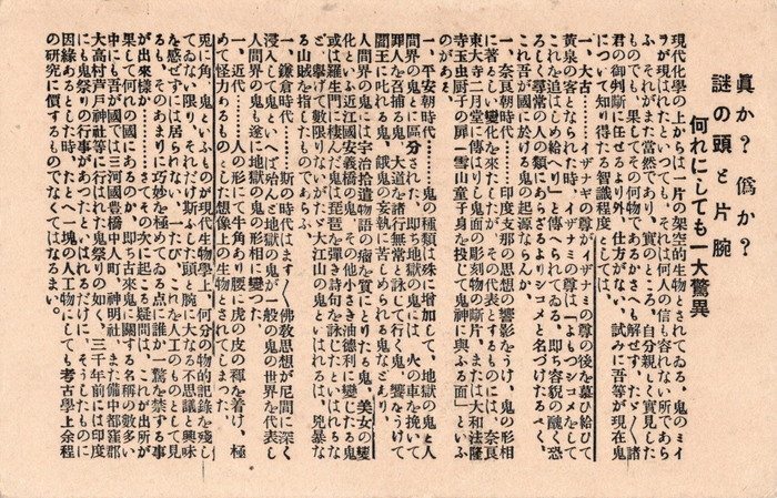 藤井 この本によると、日本産の怪物ミイラはヨーロッパに輸出されていたそうです。また、別の鬼の写真絵葉書には「真か? 偽か? 謎の頭と片腕、何れにしても一大驚異」と記されています。昔は、お客さんを呼ぶための広告・チラシのような絵葉書もあったようです。