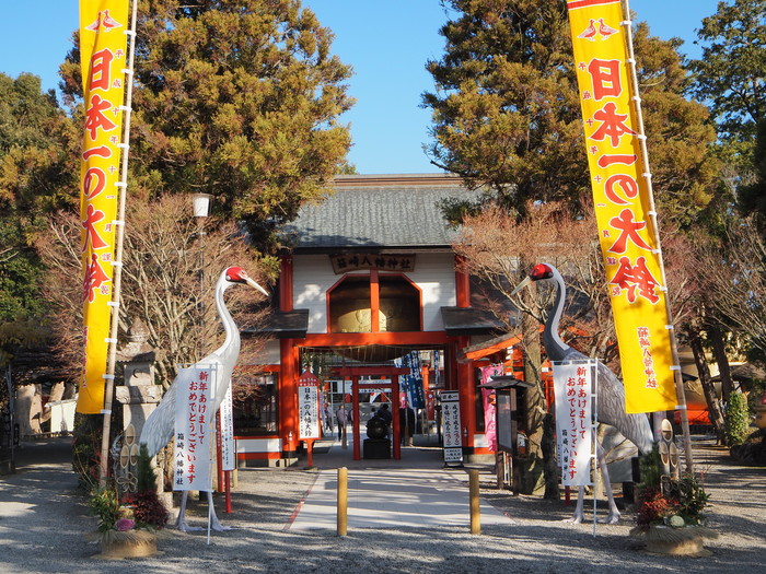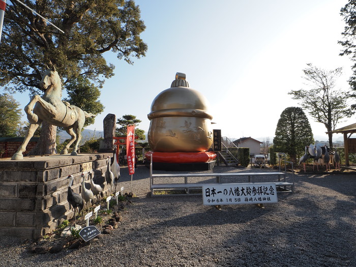 鳥居の手前には巨大な鈴があり「日本一の鈴」という文字がチラリ。ツル? 鈴? 一体どんな神社なんだ? と頭が混乱しつつ先へと進む。
