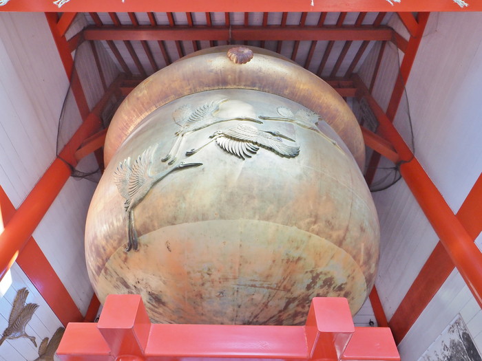 コレが日本一の大鈴なのである。確かにデカい! 直径3.4メートル、高さ4メートル、重さは5トンもあるという。金箔が貼られた表面には、やはり飛び立つツルのレリーフが彫刻されていた。