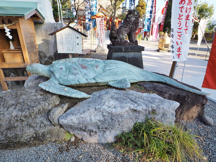 傍らには亀の像も。説明書きによると、かつては出水にもカメが産卵のために浜にやって来たという。日本最長寿の神様と千年生きるツル、さらに万年生きるというカメという長寿トリオが一堂に会する長寿スポットなのだ。まあ、カメは後付けっぽいが。