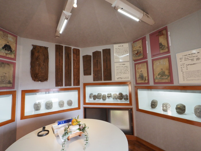 内部は案の定、円形(正確には八角形)の部屋で、この神社にまつわる宝物が展示されている。古い棟札や三十六歌仙の絵など。