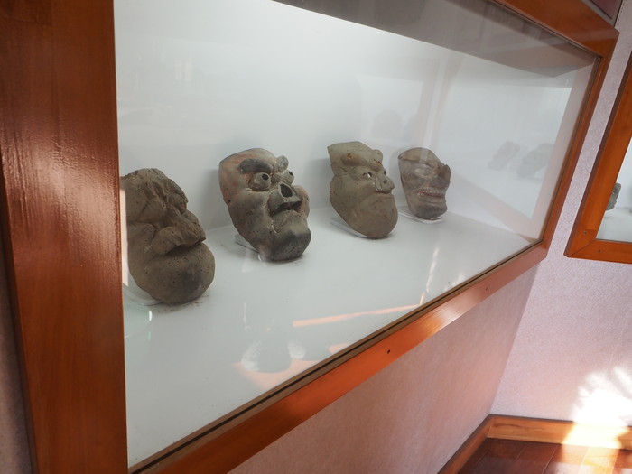 ズラリと並ぶ神楽の面。プリミティブな形状だが、歴史を感じさせる神楽面である。