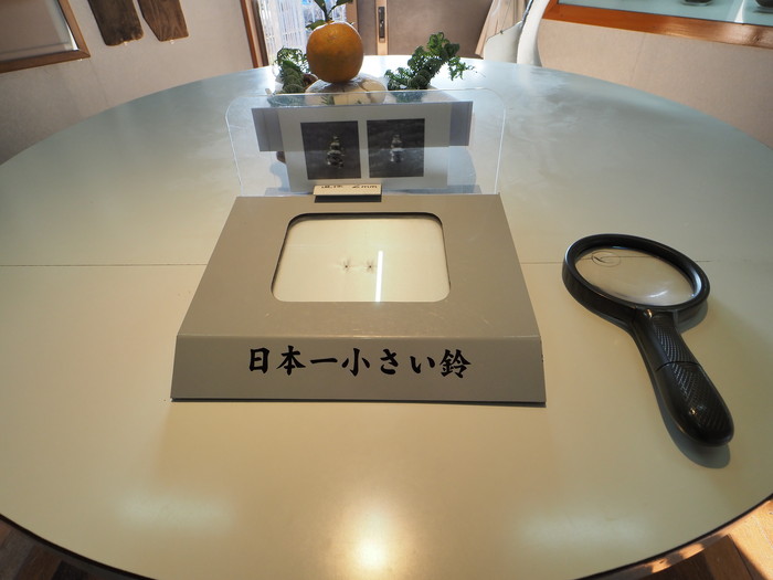 そしてお待ちかね、日本一小さい鈴。これも金と銀で対を成している。2ミリほどの鈴は肉眼では確認しにくく、虫眼鏡が置いてあった。こんなに小さくて本当に鳴るのかな? それにしてもこの神社が鈴にこだわる理由が良く判らない。ツルは判った。出水という街のシンボルであるから。一方、鈴はどうだ? 特に鈴産業が伝統工芸でも鈴生産が盛んな訳でもないだろうに。そういえば門にあった日本一の鈴の傍らに「成せば成(鳴)る、大願成就の大鈴」とあった。ダジャレ? もしかしたらこの神社とも縁が深い神楽でも鈴が使われる事から鈴を推したのかもしれない。あくまでも想像です。