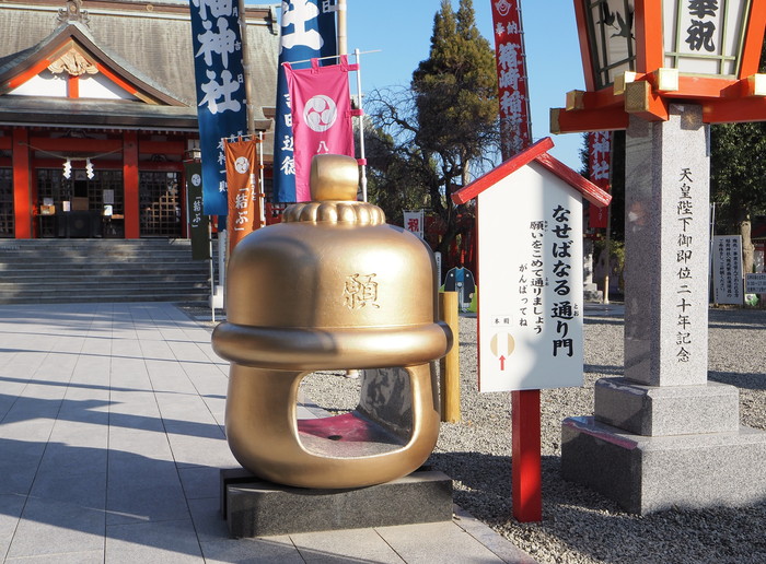 参道沿いには1メートル程の鈴のオブジェがある。これは鈴の真ん中の狭い穴を潜り抜けられれば願いが叶うというもの。
