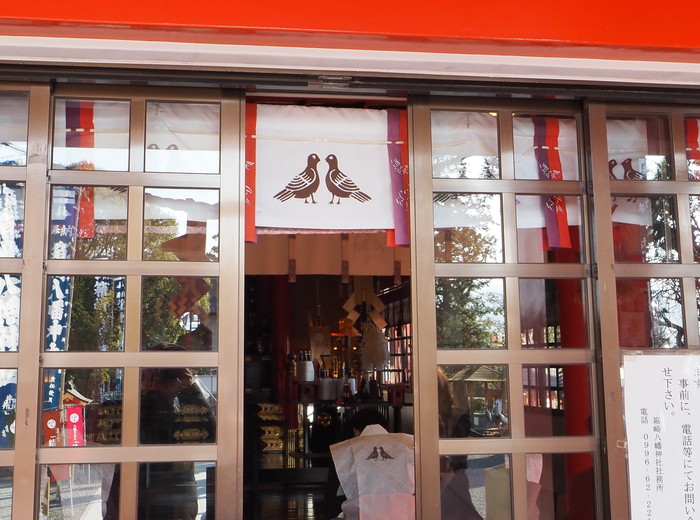拝殿内では祈祷を受ける人達が神妙な面持ちで座っていた。入り口にはまたしても鳥のイラストが染め抜かれていたので、またツルだろうなあ、と思ったがよく見たら鳩だった。