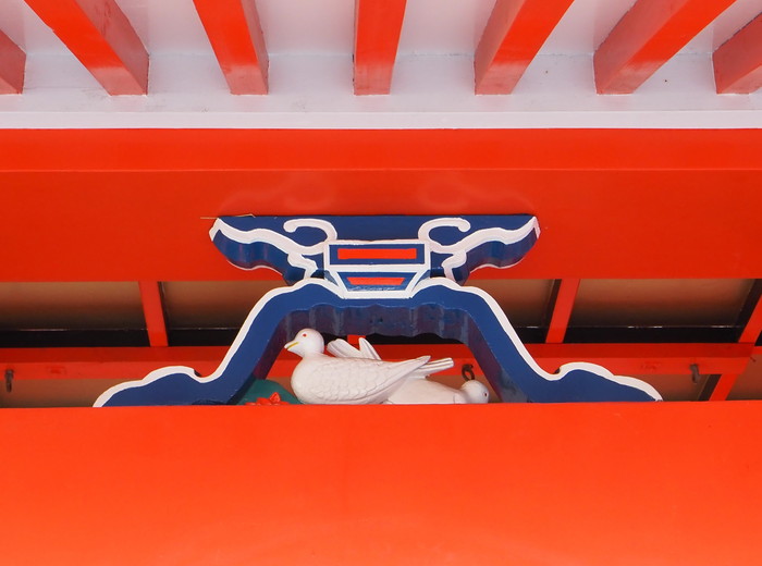 軒下の蟇股にも2羽の鳩が。