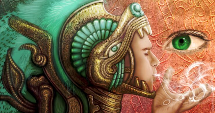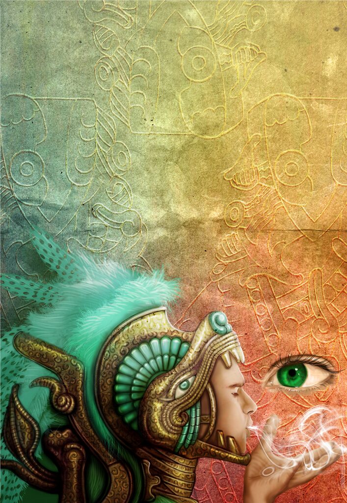 ケツァルはエメラルドグリーンの羽根を持った鳥の名、コアトルは蛇の意味で「羽根のある蛇」として描かれる事が多いですが、今回は「白神」なので白い顔の男性として表現しました。風の神でもあるので、その息は吹く風のイメージです。