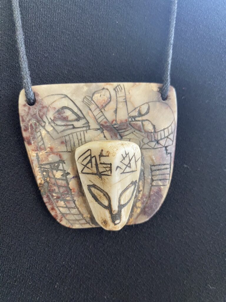 なかでも会場の注目を集めたのが、マリオ氏が身につけていた石のネックレスである。それは直径8センチほどの薄い石に細かい彫刻が施されているものなのだが、炭素年代測定の結果、なんと約1万2500年前のものであることが明らかになったのだという。