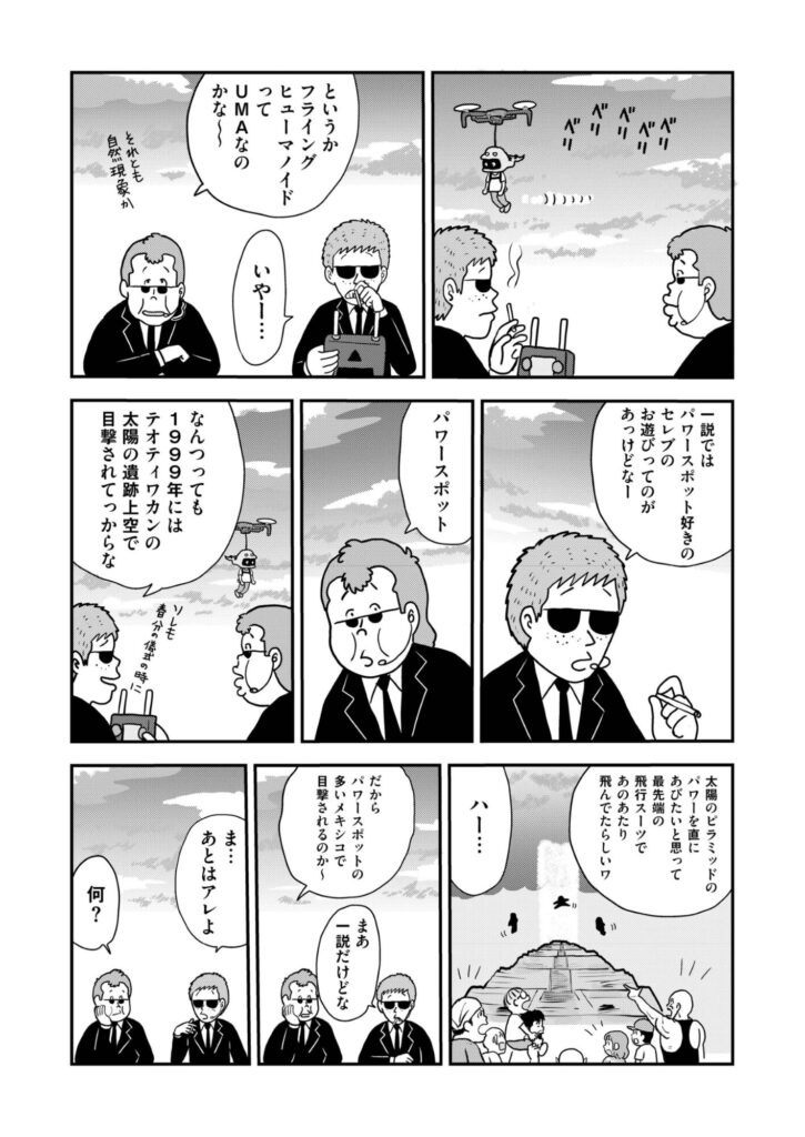 今回のネタは「フライングヒューマノイド」。文字通り、ヒト型の未確認飛行物体のことで、世界各地で目撃例があります。その正体は飛行能力のあるUMAなのか、宇宙人なのか、はたまたジェットパックを背負った秘密部隊か、新型ドローンか……。同一の種、現象ではなさそうです。