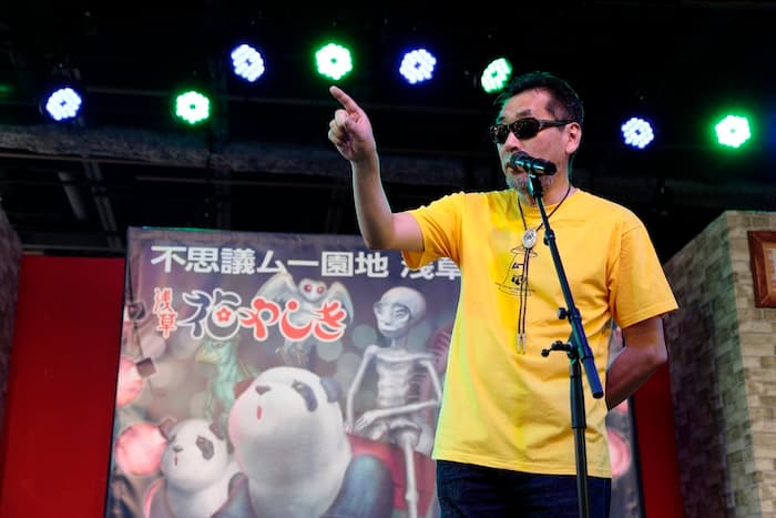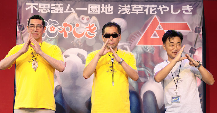 続いて登壇したのは、「ムー」の三上丈晴編集長だ。登壇するやいなや、三上編集長も「今日から名前を『ミカムー』に変える」と会場の笑いを誘い、「浅草の、草の中にあって映えるのが花、やしき」「ここが浅草の中心だ」と持ち上げた。さらに、「花」→「鼻」→「鼻は象形文字」→鼻を横から見ると「ムー」になる、と花やしきと「ムー」のつながりを(若干強引に)力説。