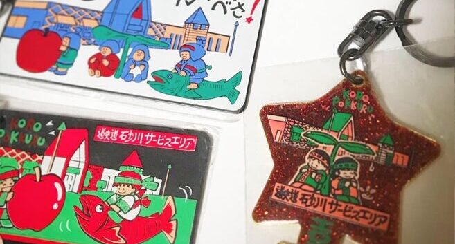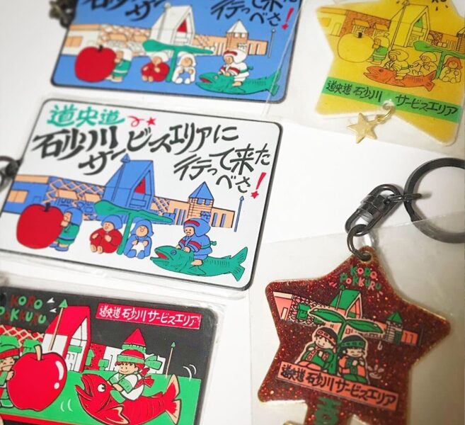 「道央道 砂川サービスエリアに行って来たべさ!」と書かれたキーホルダー。北海道には、道内全域で販売できるように「HOKKAIDO」とだけ書かれた商品が多い中、「SUNAGAWA」でもなく「砂川サービスエリア」と書いてある。つまりこの施設でしか売ることができない商品なのです。このイラストにはラワンブキの下にいるコロポックルたちが描かれていて、後ろにはこのメルヘンチックなサービスエリアの建物が描かれています。しかしキーホルダーはこれ1つだけではありません。