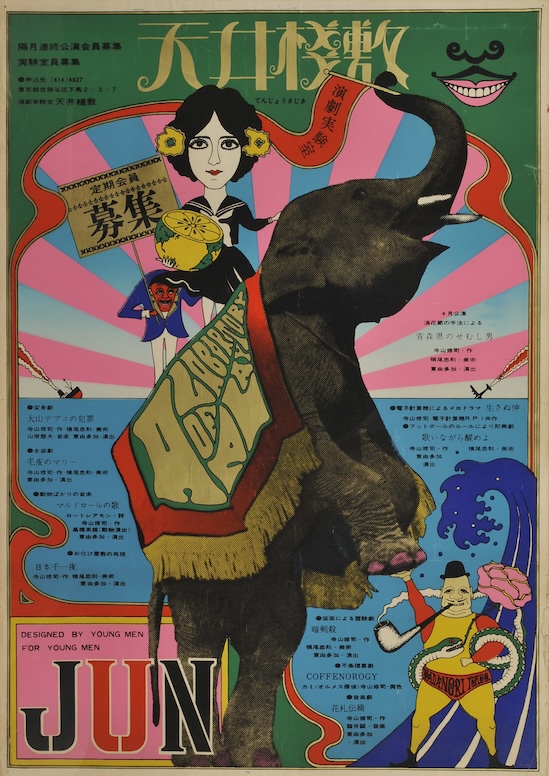旗揚げ時のメンバーとして横尾忠則も名を連ね、そのほかに宇野亜喜良やJ・Aシーザーなどのクリエイターたちも参画して活動した「天井桟敷」は、1960〜1970年代における日本のアングラカルチャーを代表する劇団のひとつとして、大きなムーブメントを起こした。