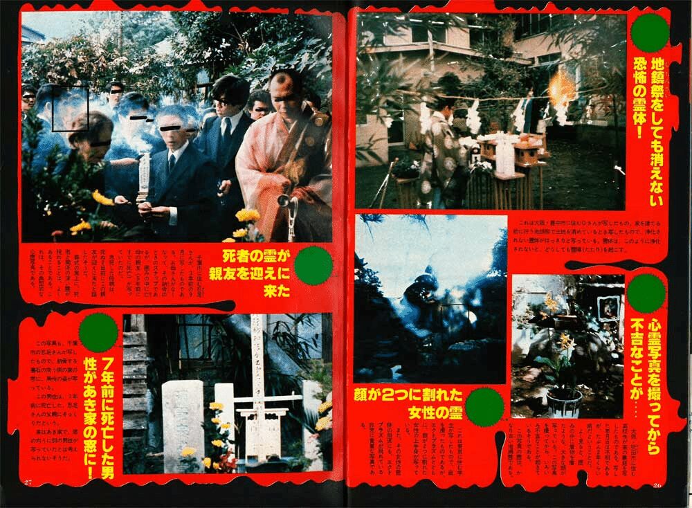 それはほとんど犯罪的な書物である。禍々しく危険な「霊的爆弾」のようなもので、それまでの心霊本とは段違いの恐怖を撒き散らしていた。どんな心霊本にもまっさきに飛びついてきた僕も、最初に『恐怖の心霊写真集』を見たときはページに触れるのさえ嫌だった。あの妙に黒色が強調された印刷の毒々しい感じ、掲載されている家族写真などに映る人の顔が、犯罪者のように目隠しの墨でつぶされている感じも含めて、なにもかもが不吉に見えた。ページに触れると、そこから黒々としたインクにこもった「凶」の「霊気」が、自分の体を「汚染」するように思えたのだ。