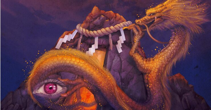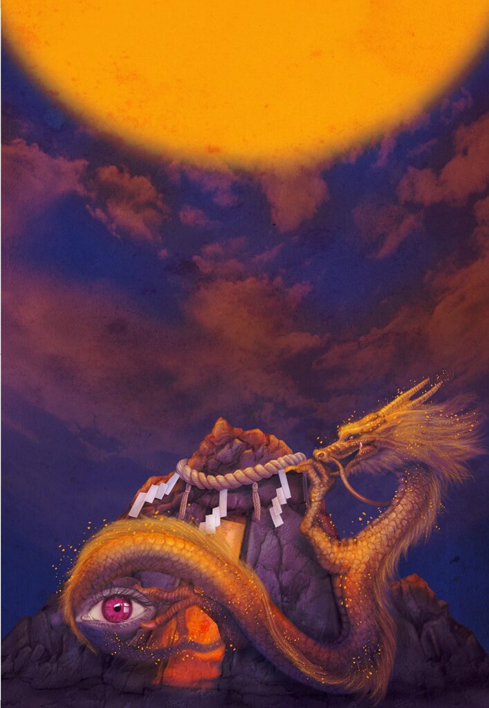 今月の総力特集の「日月神示」は、宗教家で画家の岡本天明に、国之常立神という日本神話の神が降りてきて記述されたといわれています。記紀では「天地開闢において現れた最初か6番目の神」という以外の説話はないようですが、新宗教において「国之常立神は不満を持った神々に艮の方角へ追放され、終末に世を建て直すためこの世に現れる」といった終末論が生まれたそうです。「艮の金神」である金龍が、天の岩戸から出てくる様子をイメージして描いてみました。