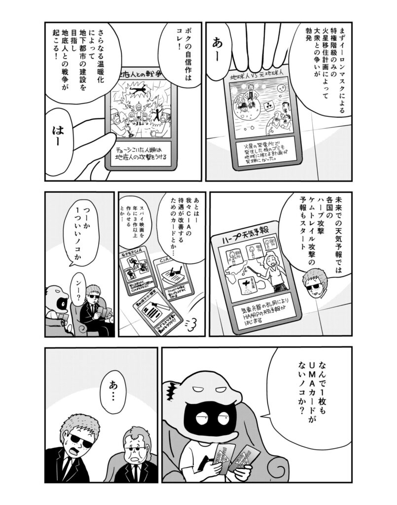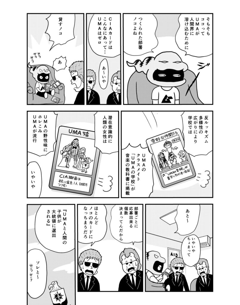 連載マンガ「MUMINz ~UMAと秘密諜報組織」です。ムー民にして都市伝説ウォッチャーとしておなじみのマンガ家・石原まこちんさんが、UMA騒動の裏に隠された諜報組織の暗躍を暴く……というもの。