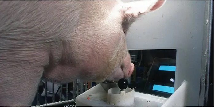 米パデュー大学動物福祉科学センターやペンシルバニア州立大学などでは、知能を調べるために豚にテレビゲームをプレイさせている。ジョイスティックを鼻で操り、画面のカーソルを動かして目標にぶつけると、おやつをもらえるルールだ。豚は難なくルールを覚え、成績も一定まで上昇した(2週間ほどで成績は下降を始めた。豚がゲームに飽きたらしい)。