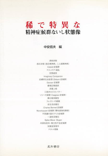 藤井 最後に「特殊な精神病」について知りたい読者にオススメの本を紹介して終わりたいと思います。『稀で特異な精神症候群ないし状態像』(星和書店)という論文集なのですが、珍しい症状について詳しく事例が書かれています。有名どころだと、自分の身体や周りの物が大きく見えたり、小さく見えたり、歪んで見える「不思議の国のアリス症候群」や、自分がもう死んでいる、もしくは死ぬこともできないという妄想を抱く「コタール症候群」ですね。