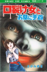 数日前の夕暮れ、隣のR小学校の女子が塾帰りに近道をしようとH神社の境内を歩いていると、鳥居のそばに立っていた「変な女」に話しかけられたという。ロングヘアーにベージュのロングコート、顔の下半分は白いマスクで隠されている。女は「私、きれい?」とたずねたそうだ。スラリと背が高く、目鼻立ちも美しい人だったので、女の子はとまどいながらも「はい」と答えた。女が「これでも?」と言いながらマスクをとると、そこには耳まで裂けた口があった。女の子は悲鳴をあげたが、その口は鋭い鎌で切り裂かれた……。