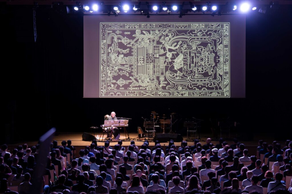 まず、この記事を読んでいるムー民のあなたに、どうしても伝えたいことがあります。ホール内の雰囲気は、心地よい期待感で溢れたかなりモダンでおしゃれな大手町三井ホールだったのですが、そこに吊るされていた巨大スクリーンにcon TIKIのマークが大きく映し出されたのですが……それが、これ!