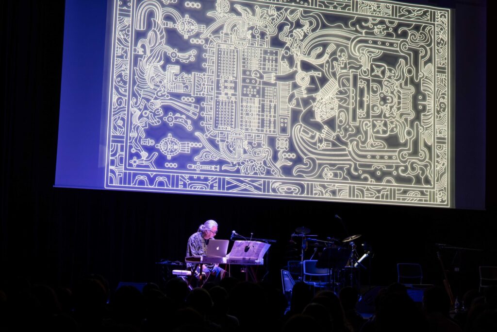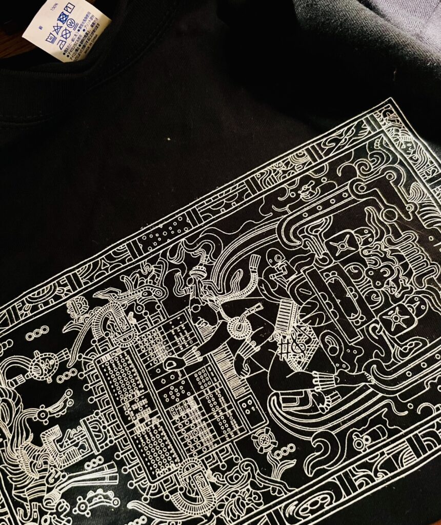 植松 はい(笑)。これね、マヤのパレンケの石棺の蓋の絵をモチーフにしているんですけど。本来は、ロケットみたいなものが彫り込まれている部分をロケットじゃなくて“アナログシンセ”って楽器にしてあります。