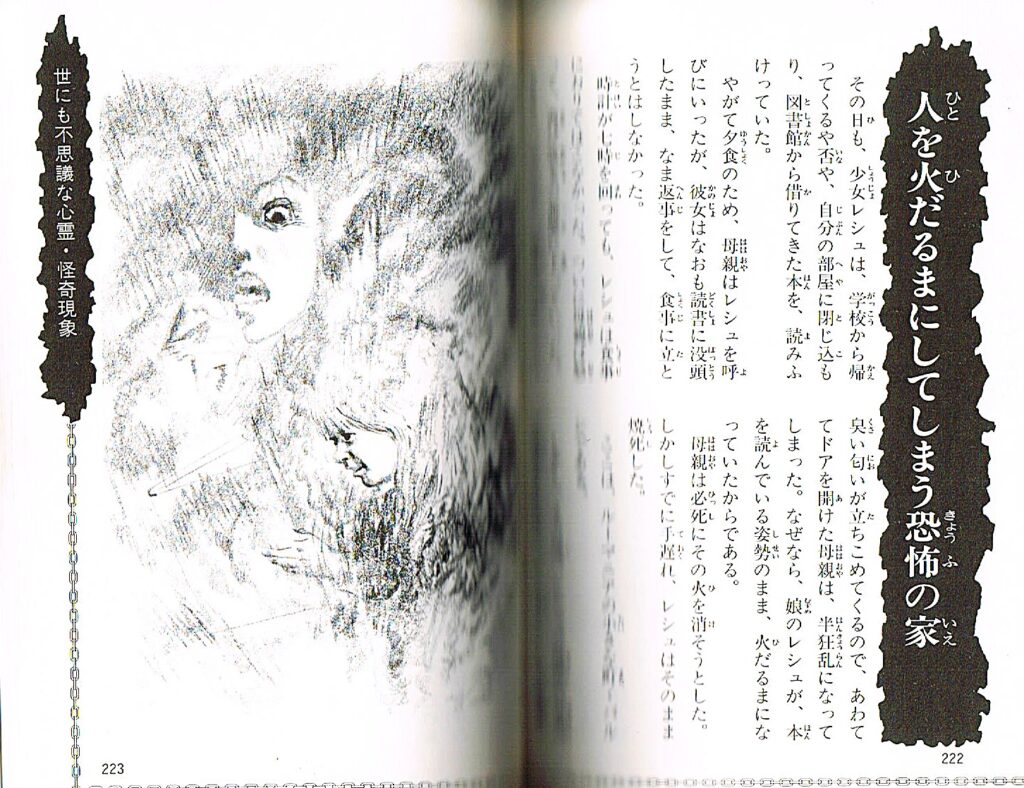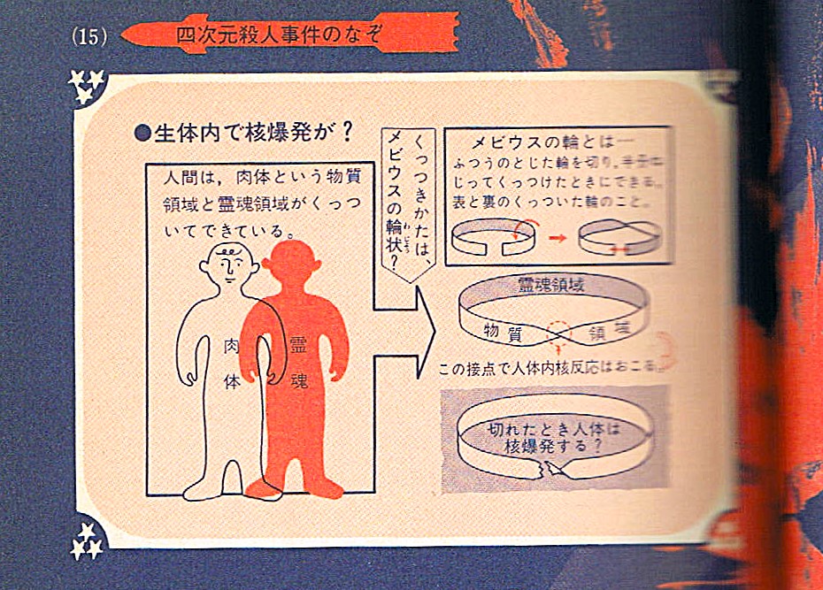 斎藤氏のオカルト本は怪奇現象を紹介しつつ、それに独自の科学的解釈を付して読者を納得させるものが多いのだが、この「人体自然発火」に関しては「人体は三次元的肉体と四次元的精神の結びつきでできているが、このバランスが崩れると原子の変化が起きて『生体内核反応』が起こるのかも知れない」と解説している。子どもの頃に読んでさっぱり理解できなかったが、今読んでみてもやはりまったく理解不能な解説である。