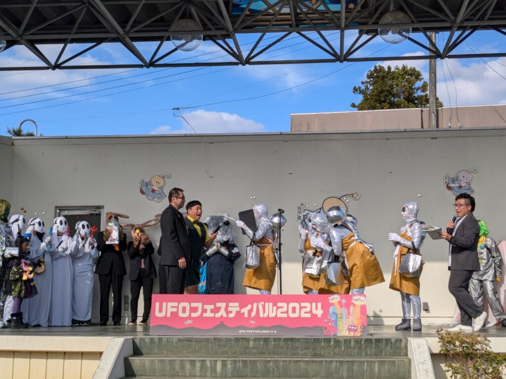 飯野町には1992年11月にオープンした「UFOふれあい館」があり、2021年には「国際未確認飛行物体研究所」が設置されていることは紹介してきたとおり。飯野町は歴史と実績あるUFOタウンなのだ。ちなみに、国際未確認飛行物体研究所の所長を、月刊ムー編集長・三上丈晴が務めていることもあり、「ムー」との縁も深い町。今回の「UFOフェスティバル2024」でも、恒例の「宇宙人仮装」の審査や「UFOミステリートーク」で三上所長が参加している。