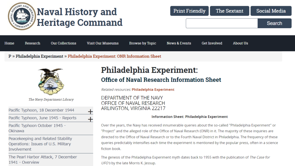 海軍文書のアーカイブ的な『Naval History and Heritage Command』というサイトがある。このサイトで、1996年9月8日にアップされたフィラデルフィア実験関連の資料を見つけた。A4用紙1枚程度のスペースに記されているのは、海軍によるきわめてオフィシャルな形の否定だ。