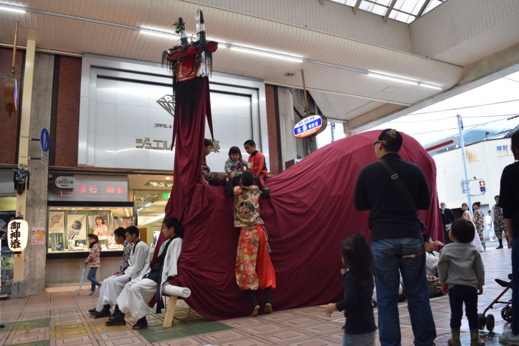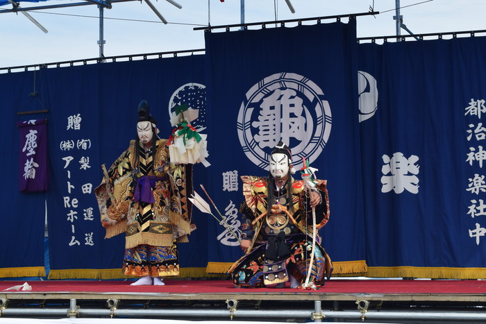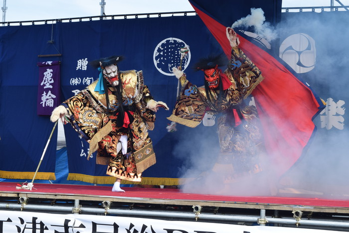 もう一つ、塵輪を語る上で避けて通れないのが、島根県西部、旧石見国で広く演じられる石見神楽だ。「塵輪」はその演目の一つで、仲哀天皇、高麻呂、そして白鬼・赤鬼二体の塵輪によって演じられ、舞台を周りながら激しく踊る。また仲哀天皇は、天鹿児弓(あめのかごゆみ)と天羽々矢(あめのはばや)を武器とするが、これは記紀神話において、高天原より出雲に派遣された天若日子(あめのわかひこ)が授けられたものである。