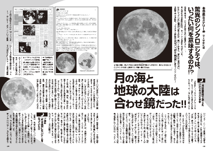 2年前にフェイスブックにアップされた、ちょっと変わった書き込みを教えてもらった。「月は地球の鏡じゃないかしら…?」という言葉から始まるこの書き込みは、月面の模様がそのまま地球の大陸や海の配置の反転画像に見えることについて綴られている。「(月は)銀かプラチナのような金属?か、ガラス?のような感じを受けます」という一文が印象的だ。